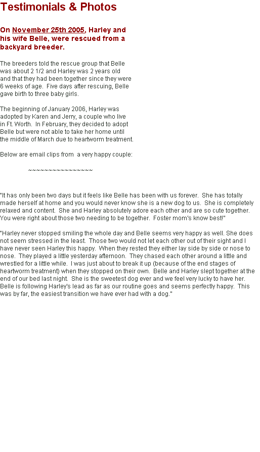 Testimonials & Photos Our Dog's Stories Extreme Make-overs Business Partners Angels (AKA Donors) Other Rescue Links