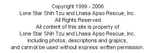 Lone Star Shih Tzu and Lhasa Apso Rescue (LSSTLAR) is an all volunteer organization dedicated to the rescue, rehabilitation and re-homing of abused, abandoned and neglected Shih Tzus and Lhasa Apsos. We are a 501(c)(3) charitable organization which means your donations may be tax deductible. |
