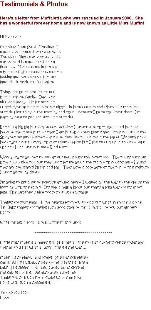 Testimonials & Photos Our Dog's Stories Extreme Make-overs Business Partners Angels (AKA Donors) Other Rescue Links